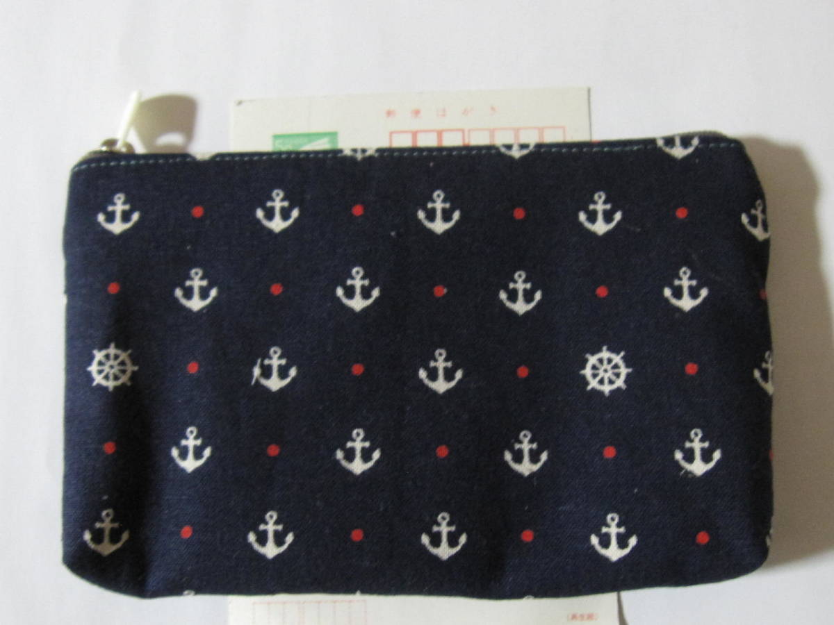 > 手作り 大 ポーチ 濃紺 マリン柄 碇舵 ドット 模様 リネン 小柄 水玉 ハンドメイド 財布 小物 数珠 充電器 めがね 男女 兼用 ネイビー 幅広