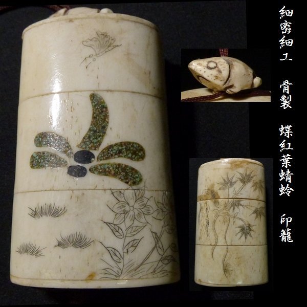 【 恵 #0415 】 骨製 細密彫刻 t蝶紅葉蜻蛉 細工 印籠 蛙 緒締 検:提げ物/薬入れ/煙草入れ拍卖