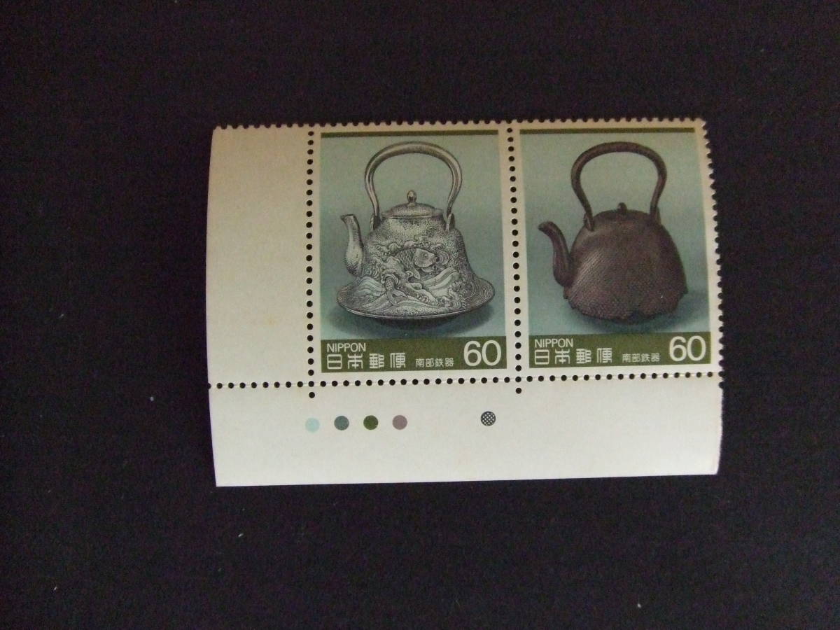 > 日本切手ー未使用 1985年「伝統的工芸品シリーズ」第5集 南部鉄器 60円ペア1組 耳付き