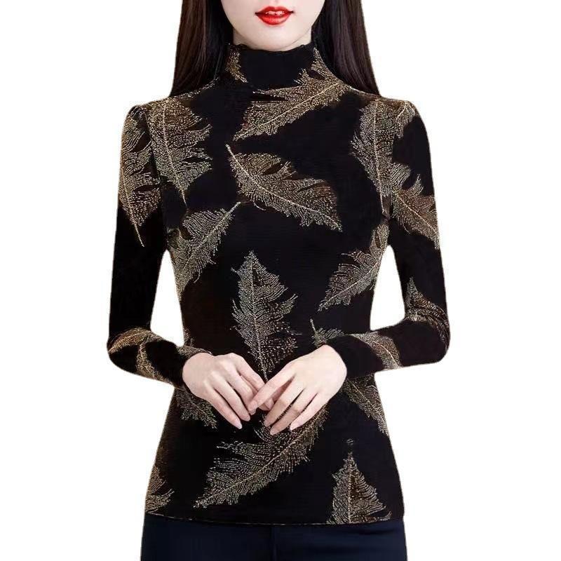 - 【ブラック&イエロー・L】レディース 長袖カットソー★タートルネック★リーフ柄