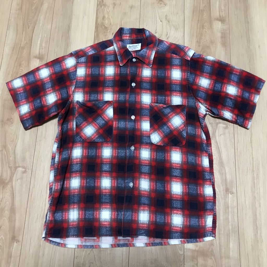 - 60's〜70'sビンテージ チェック 半袖ネルシャツ 半袖シャツ カットオフ? ボックスシャツ オンブレ