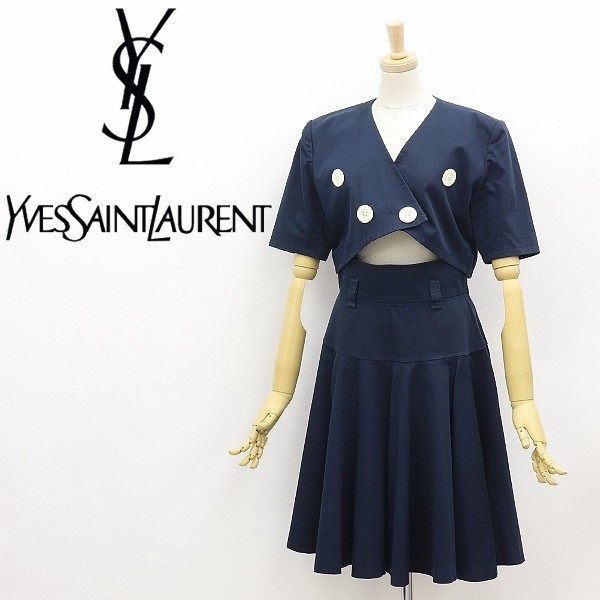 > ヴィンテージ◆Yves Saint Laurent イヴサンローラン コットン ノーカラー ショート丈 ジャケット&フレア スカート ネイビー M/L