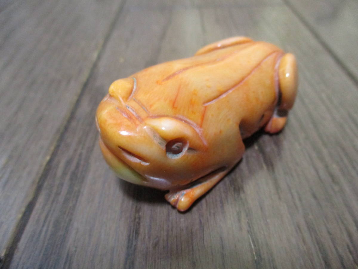 - カエル フロッグ 石製 宝石 置物 オレンジ 燈石 サンゴ 幅6.5cm程度 オブジェ 可愛カエル レターパックプラス