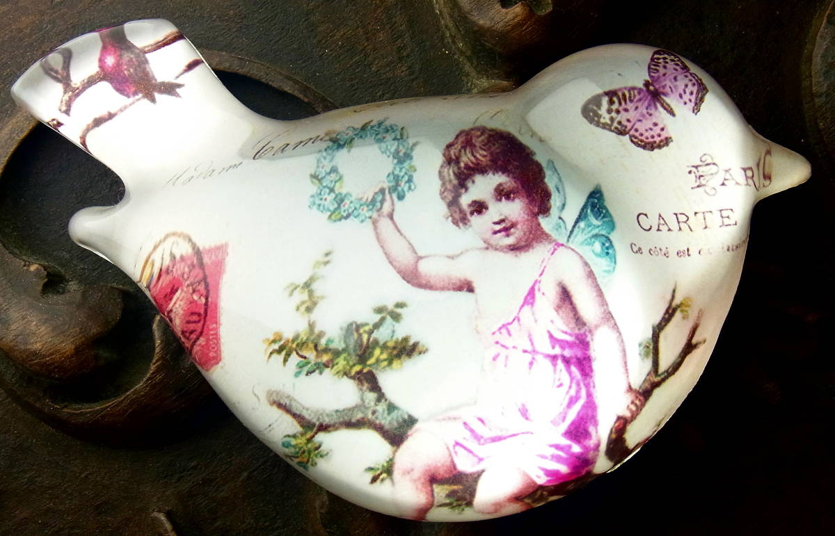 - フランスビンテージ 小鳥のペーパーウエイト ドーム型ガラス 文鎮 CARTE PARIS 妖精 鳩 切手 オブジェ民芸