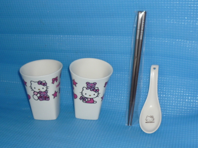 - bレア品★未使用★2005年ハローキティ&くまちゃん タンブラーx2個とレンゲ・箸セット