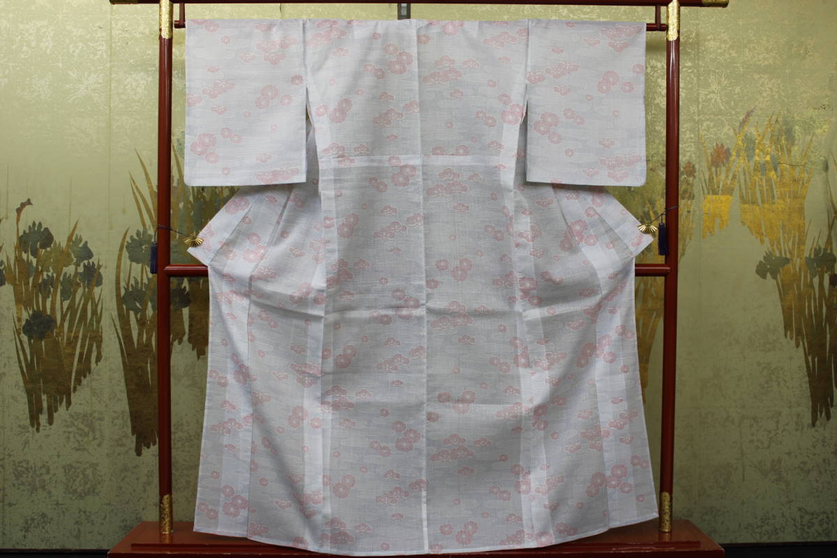 > きもの今昔4935 単衣のきもの バチ衿単衣仕立て 白地に絣の蚊絣と亀甲絣で横雲や花や松の柄 美品 身丈156cm
