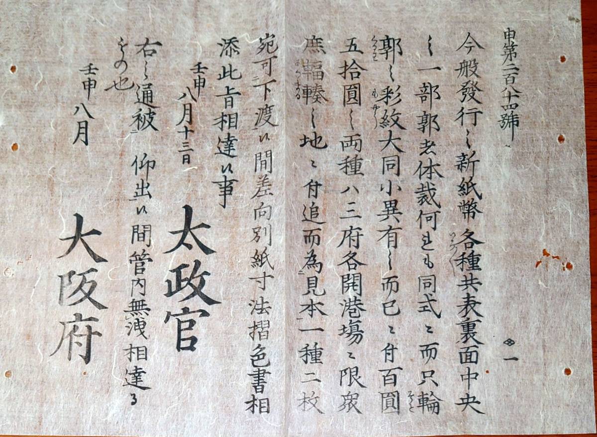 - f23032313〇明治布告 今般発行の新紙幣 百円 五十円見本 寸法摺色 明治5年 大阪府〇和本古書古文書
