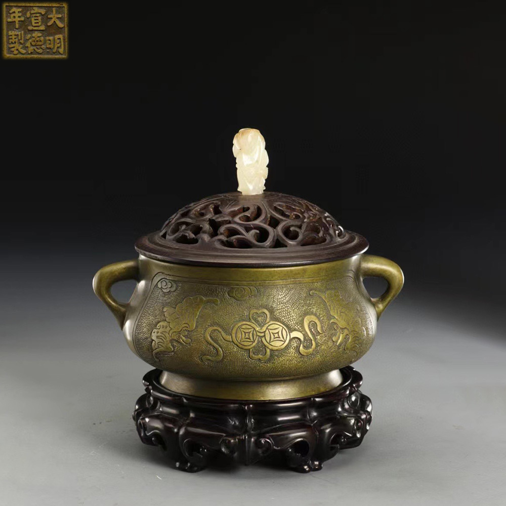 > 古銅彫 中国・明時代 「大明宣德年製」 銅製福在眼前紋両耳銅香炉 紫檀蓋座 玉鈕 香道具 火舎 文房置物 唐物 LT-04105