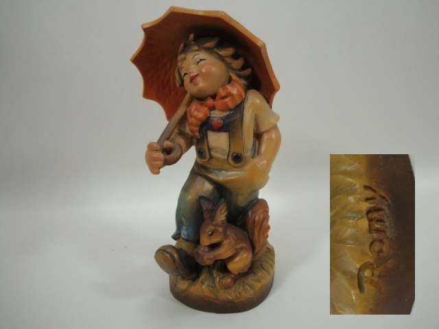 - ロミー 木彫り オレンジ色の傘の少年とリス 人形 Romy 置物 イタリア