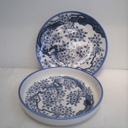 - 大皿 2枚 セット 鉢+大皿 桜の模様 花 染付 未使用 ブルー /15N3.25-64