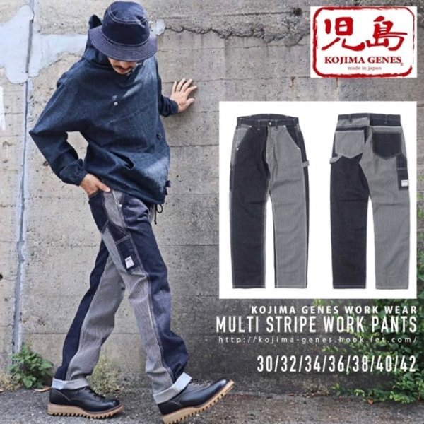 - 送料0 児島ジーンズ KOJIMA GENES デニムマルチストライプワークパンツ RNB-1084d-DENIM/HICKORY-38 切替ワークパンツ ペインター アメカジ