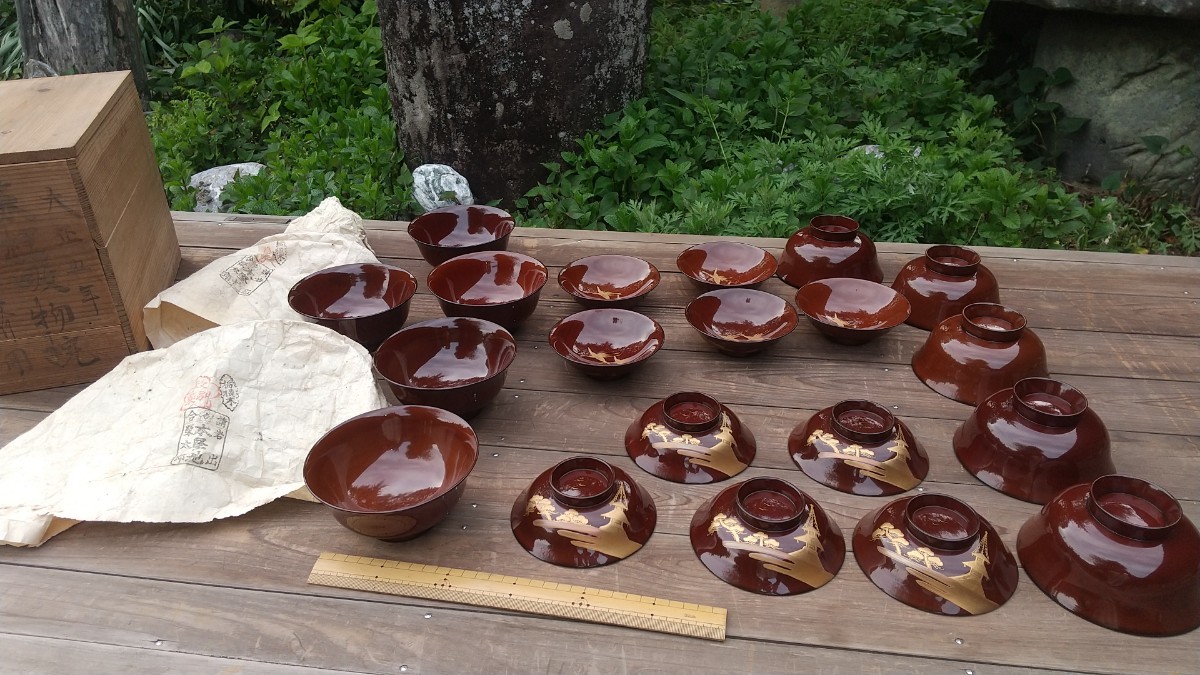 - 塔に松、鶴見返り蒔絵 吸物椀10客 木箱 ① 大正五年