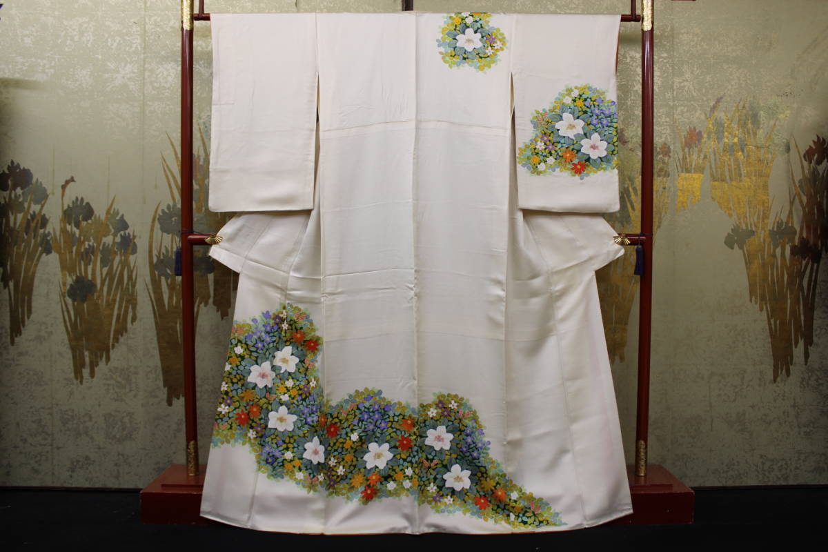 - きもの今昔5119 附下訪問着 正絹綸子地白アイボリー地色 手素描きの花柄白椿や桔梗など 身丈163cm
