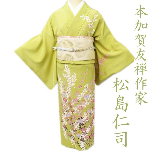 > ★きもの北條★ 特選 本加賀友禅作家 松島仁司 花の図 たおやかな花々の彩り ややくすんだ鶸色 着物 訪問着 A792-4 M 【中古】