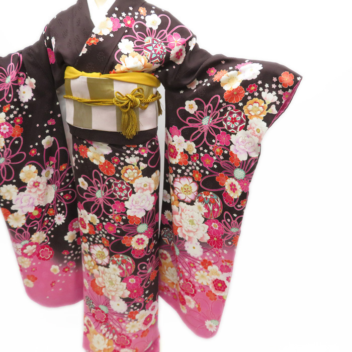 - ★きもの北條★ 振袖 正絹 花模様 金駒刺繍 成人式 結婚式 結納 パーティー トール 焦茶色 A592-5 L【中古】