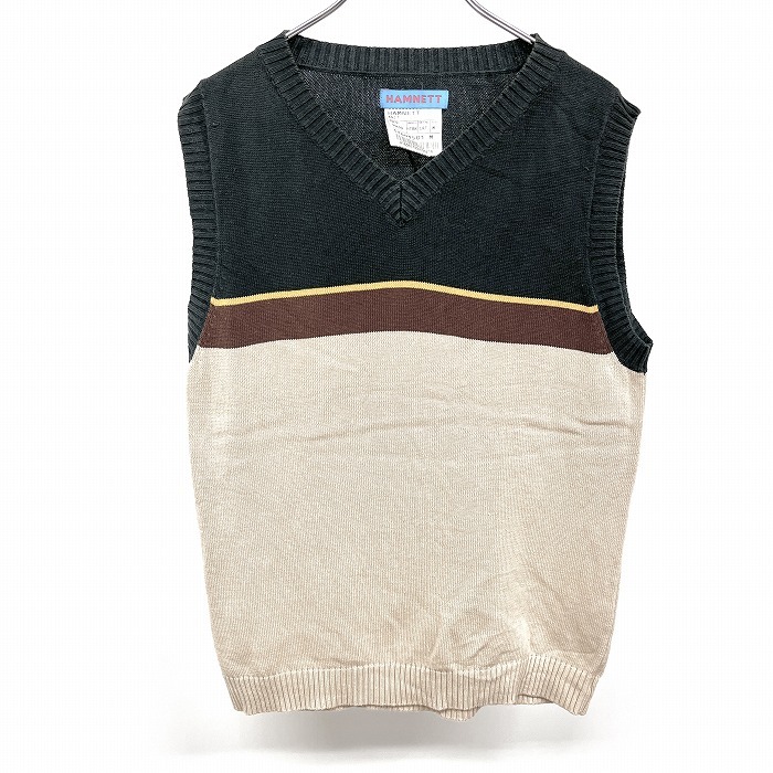 > ハムネット HAMNETT ニットベスト ノースリーブ セーター Vネック ボーダー 綿100% コットン M 緑×黄×茶×ベージュ レディース(メンズ?)