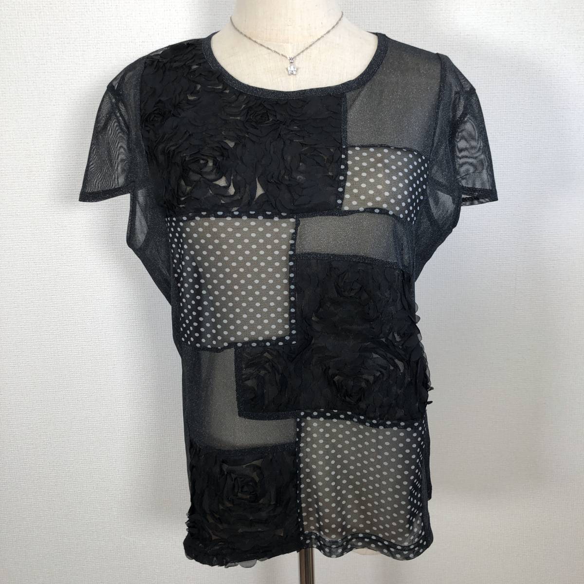 - WS0041 美品 FASHION MESSAGE レディース Tシャツ 半袖 美しい 黒 フラワー シースルー 華やか ロマンチック ドット モノトーンモード