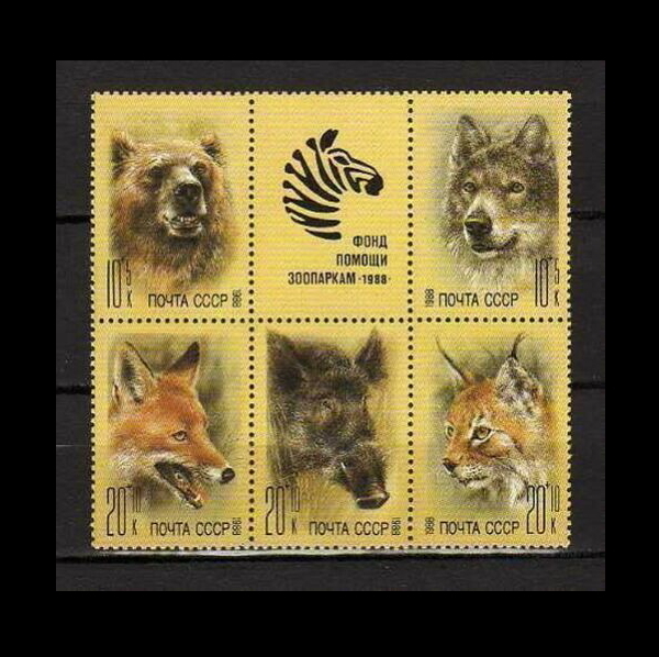 - ■ソビエト切手 1988年 野生動物 5種ブロック完 / ソ連・ロシア