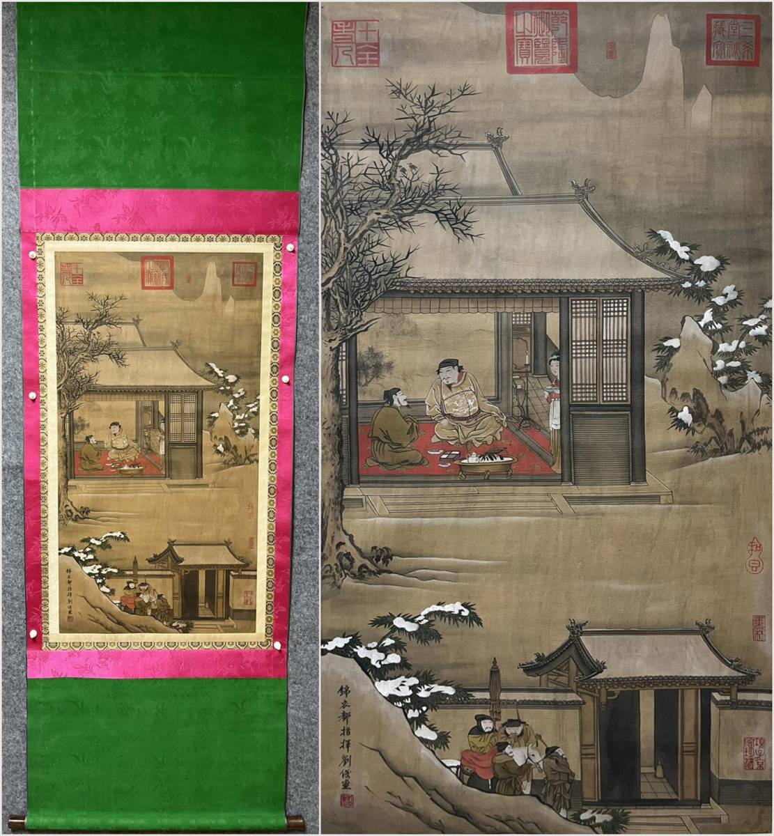 - 古美術 掛軸 中国・明時代 劉俊書 「雪夜訪友図」 絹本 立軸 書道 巻き物 真筆逸品 肉筆保証 唐物 古画 LT-06240