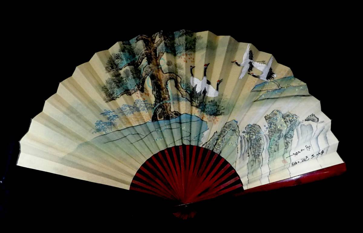 > 縁起物 中国古玩 中国掛扇 大扇子 鶴 山水画 扇 飾り扇 1970年代 長さ64cm 幅(開いたとき)115cm 中国では扇は魔よけの意味があります SMN