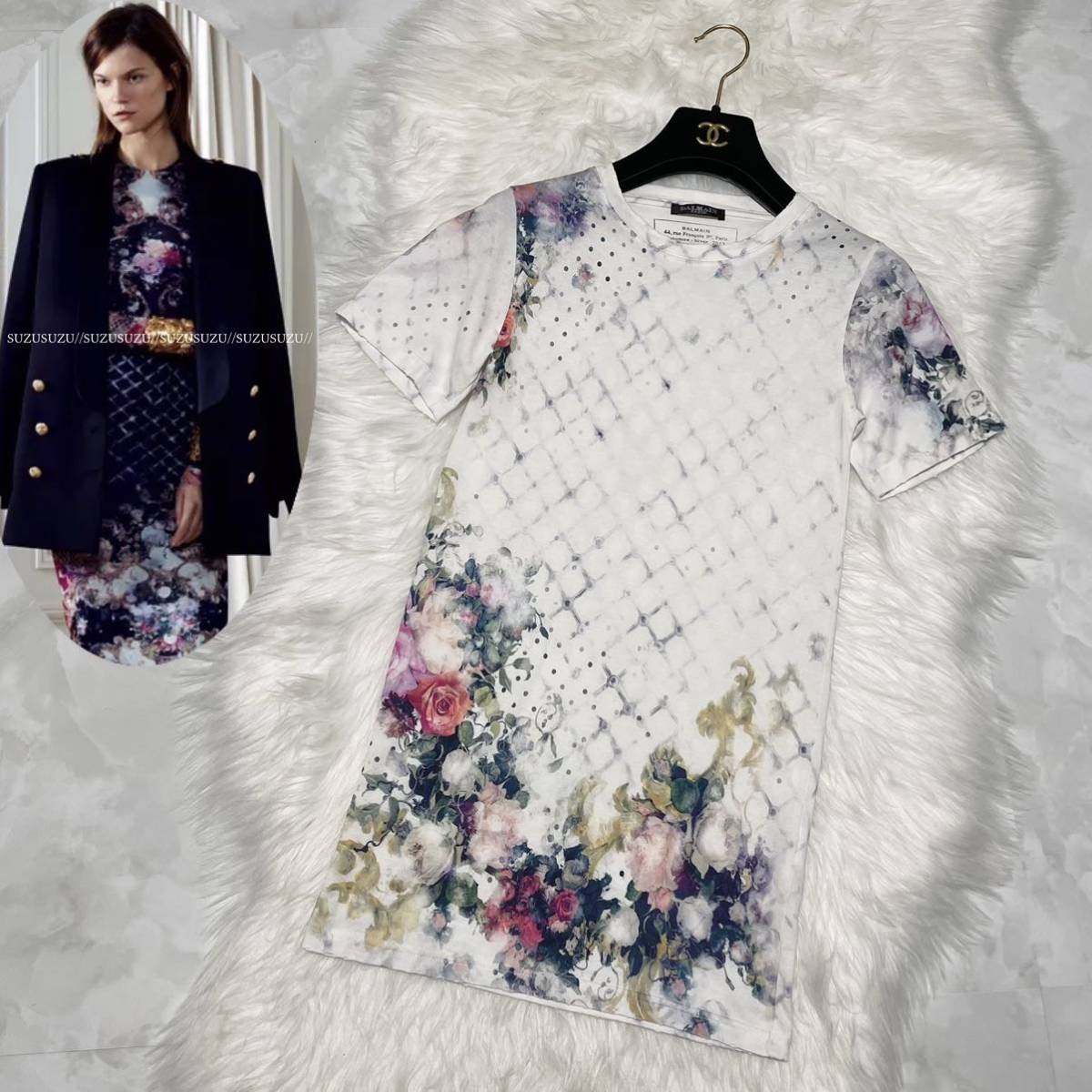 > 本物 バルマン 花柄 バラ フラワー ダメージ加工 半袖 Tシャツ トップス ミニ ワンピース チュニック 34 BALMAIN レターパック可