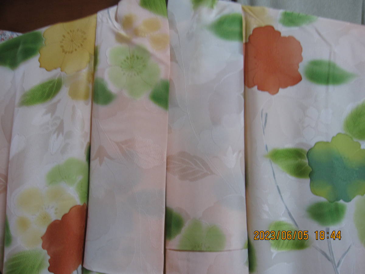 > 小紋 正絹 大花柄 *左袖裏地に目立つシミあり。リメイク用 古布 裄65,身丈157,袖丈55 パーティー、茶会 名古屋帯 付け下げ