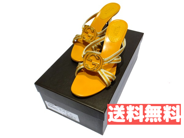 > $ 美品 $ 箱付き ◆ GUCCI ◆ グッチ ◆ ミュール サンダル ◆ GGロゴ◆ オレンジイエロー系 レザー製◆ 表記 35C・サイズ 22cm ◆ 夏