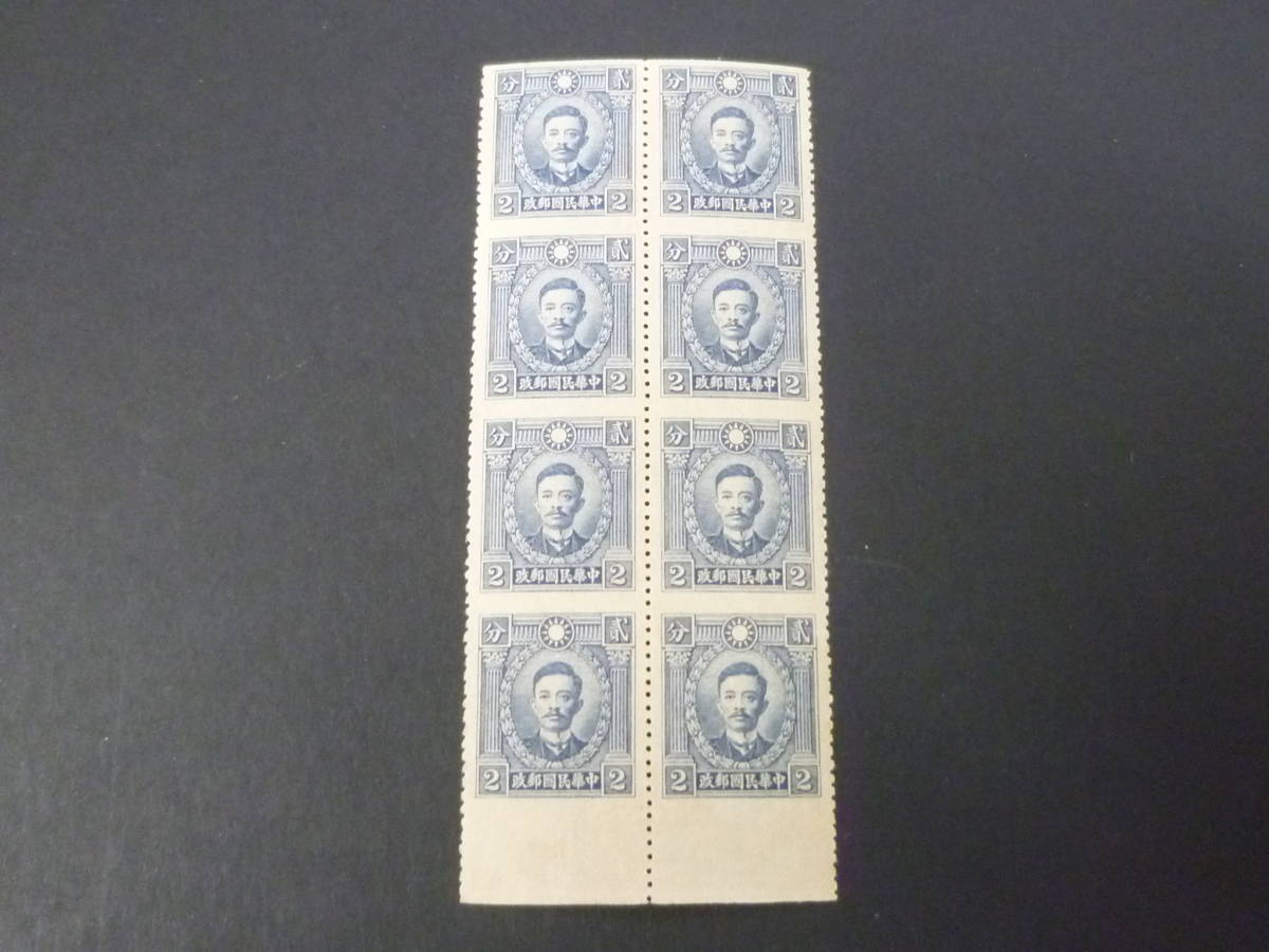 - 23L A №54 旧中国切手 1940-41年 JPS#490a 香港烈士像 無水 2c 中間無目打 8枚ブロック 下部耳紙付 未使用NH・VF ※説明欄必読