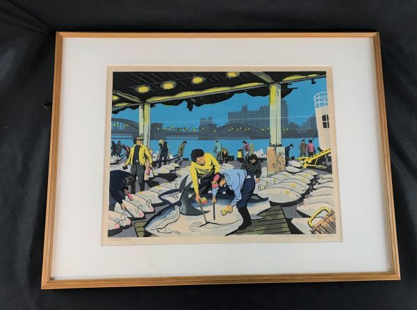 - 0u1k37E116 【真作】 北岡文雄 『大物賛歌』 木版画 1988 魚河岸 額装 春陽会会員 日本版画協会会員