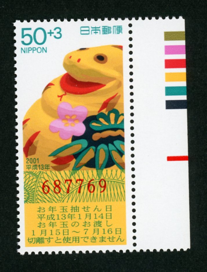 22194◆2001年用 年賀切手ヘビ53円CM右単★美品 平成13年用 50円
