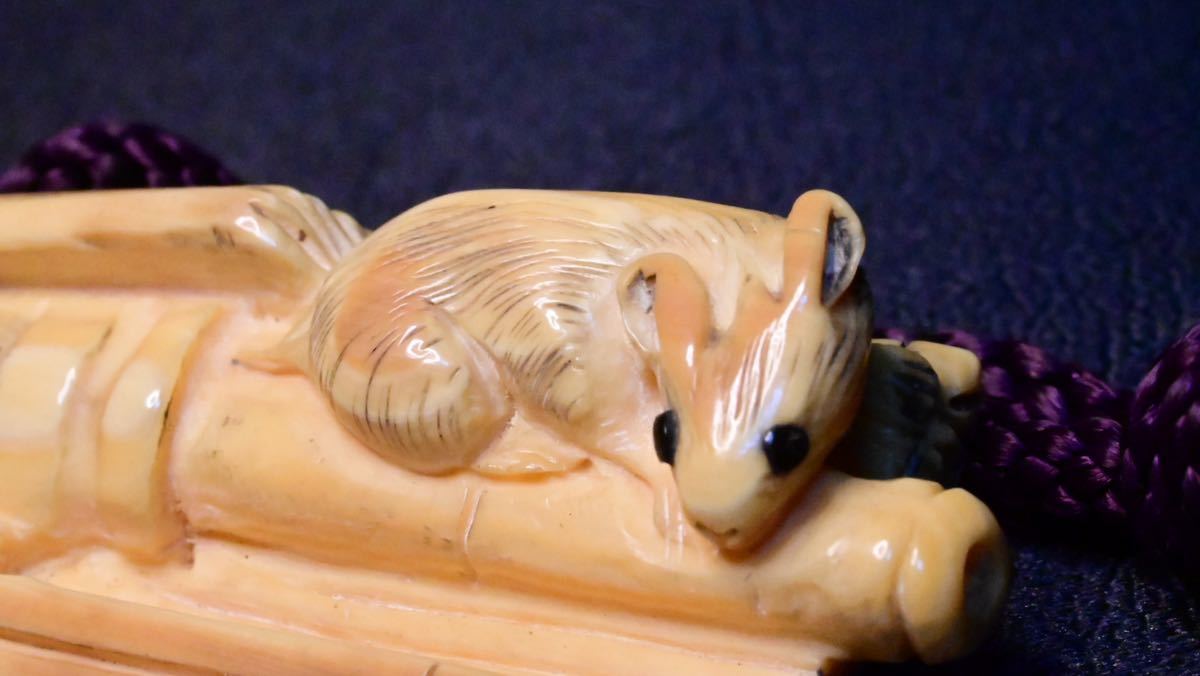 - 根付 提げ物 NETSUKE 在銘 光政 鼠 番傘