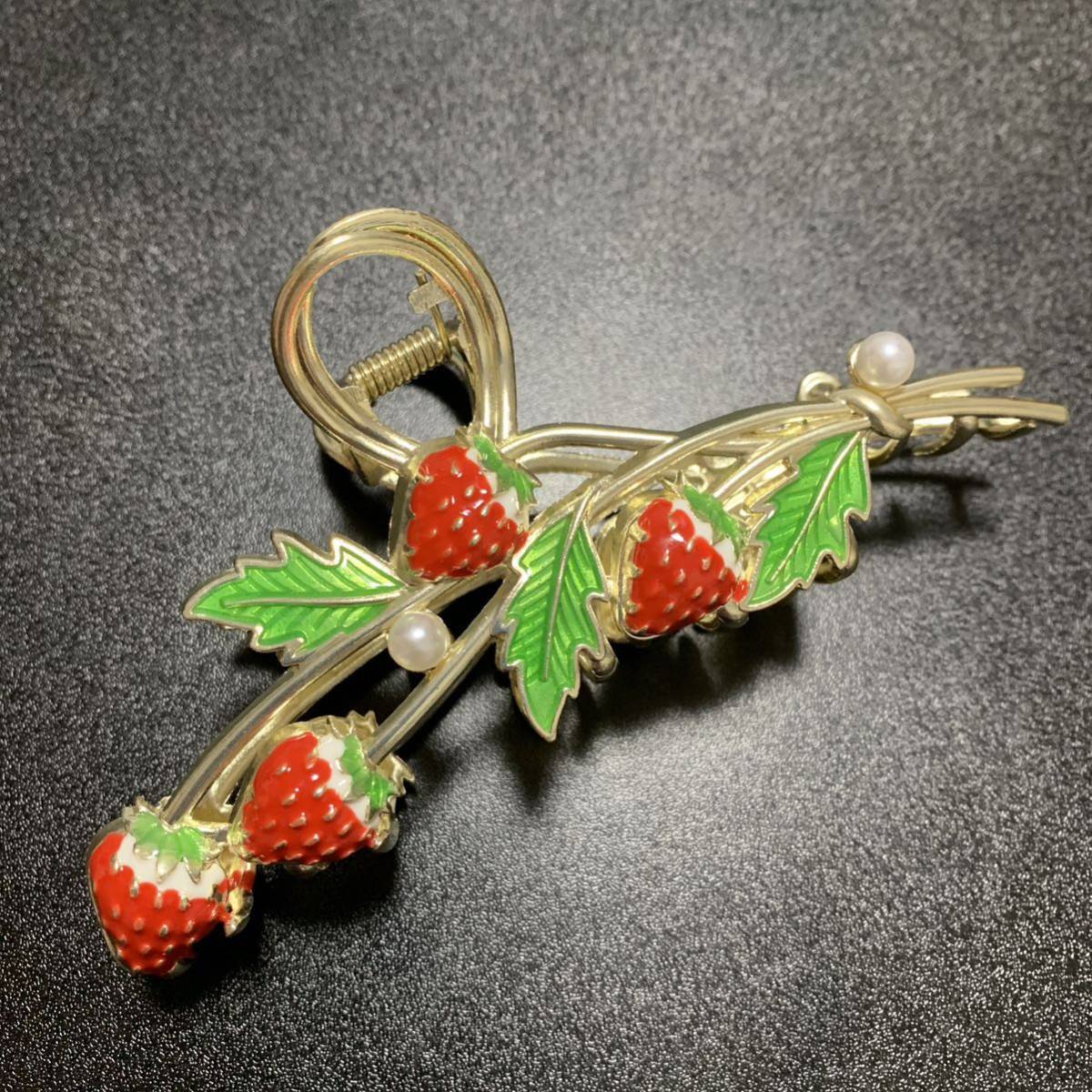 - 夢可愛い レッド 苺 フェイクパール付き ヘアクリップ ゴールド