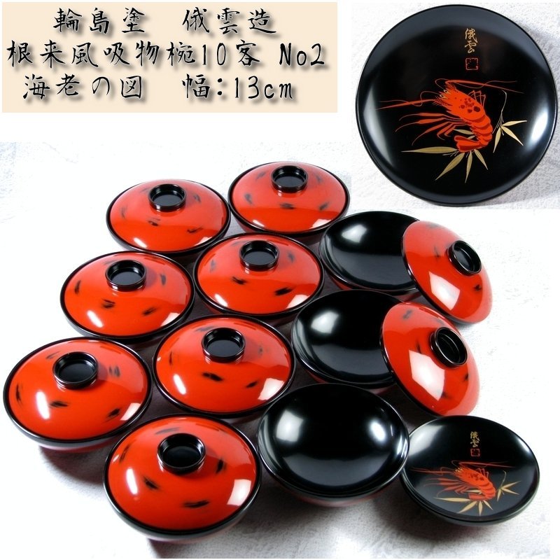 - 輪島塗 俄雲造 根来風吸物椀10客 No2 海老の図 幅:13cm 美品/煮物椀/23i022