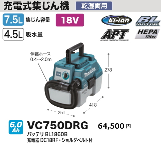 - マキタ 18V 充電式 集じん機 VC750DRG 6.0Ah 新品