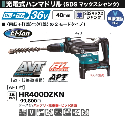 - マキタ 40mm 充電式 ハンマドリル HR400DZKN 本体のみ ケース付 18Vx2本 36V 新品
