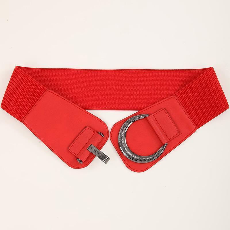 - 【レッド】 幅広ゴムベルトリングブラックゴールドバックルレディース