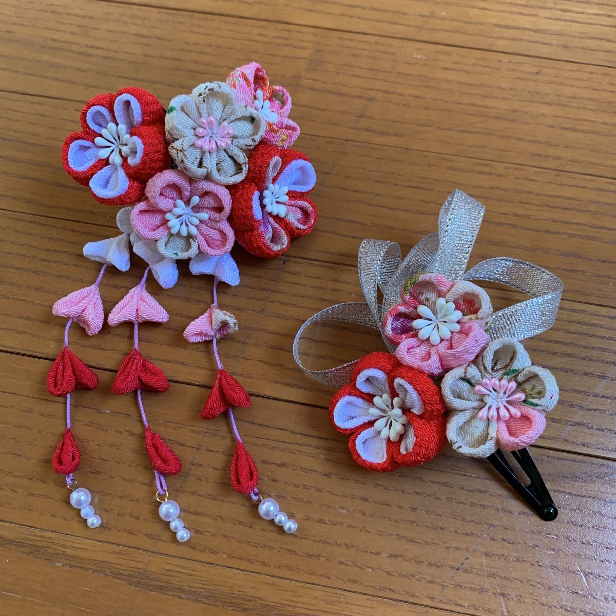 > ハンドメイド七五三つまみ細工髪飾り (桃赤)2点セット