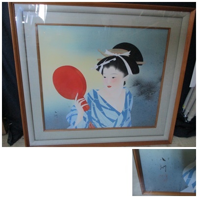 - ★額 飾り 着物女性 鏡を持っています 縦60㎝ 横66㎝ 奥行4㎝ ※汚れキズあり tm2309-29-6★
