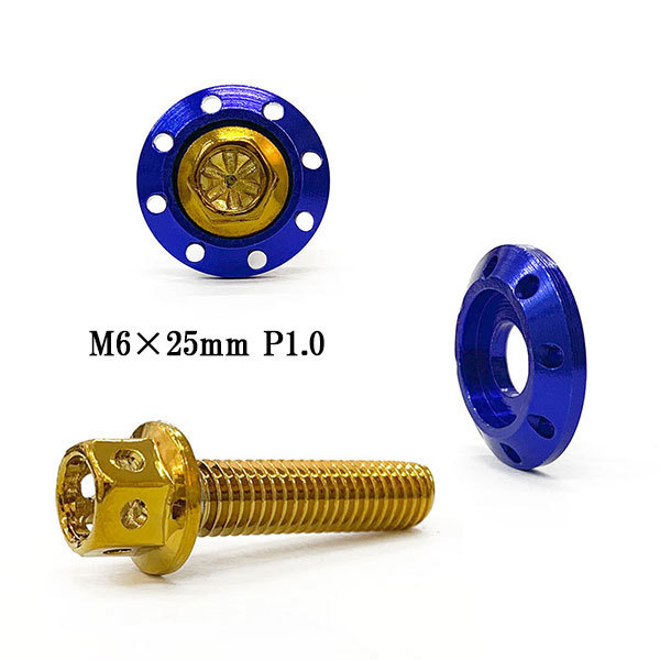 > M6 25mm フランジボルト P1.0 座面枠 20×4mm アルミ カラーワッシャー デザイン フジツボ 車 バイク ドレスアップ ゴールド×ブルー
