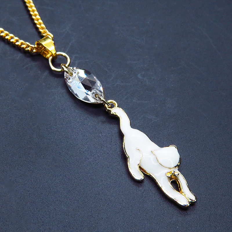 - ゴールドカラー くつろぎ白猫とスワロフスキー(クリア)の大人可愛いネックレス 長さ調整可 アジャスター追加可
