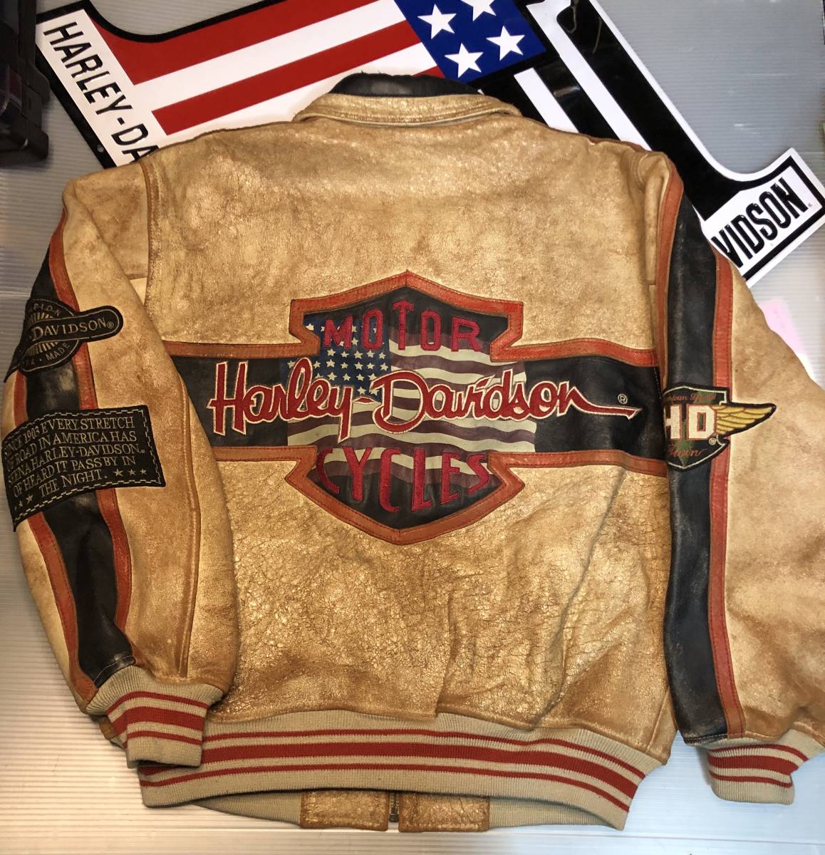 > 【レアなモデル!立体大型刺繍】ハーレーダビッドソン ゴートスキン&カウハイド・レザー本革ジャケット 超イケてるルックス AVIREXタイプ