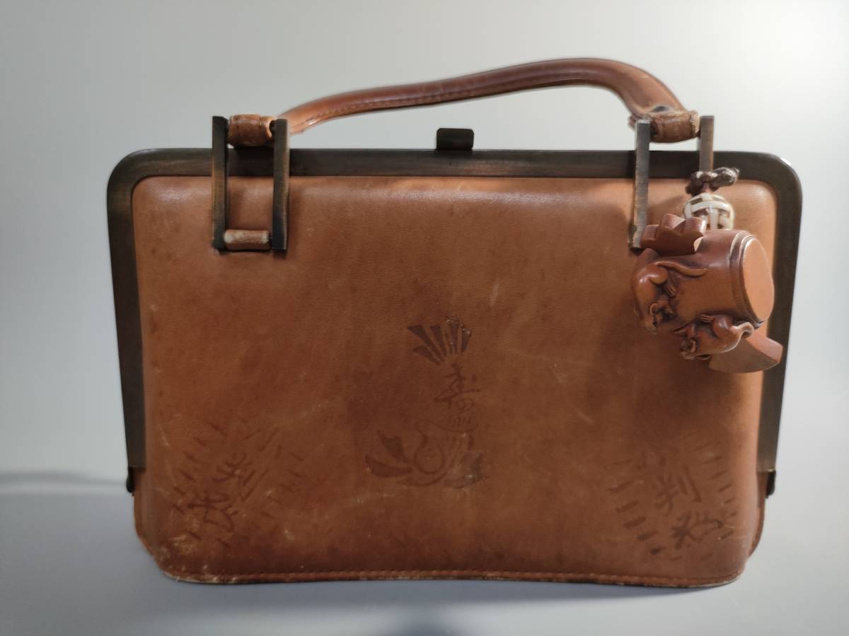 - 57. COSMO TENCHIDO chikyudo【銀座天地堂】革 バッグ 茶系 根付 小槌/ネズミ2匹(永正) リメイクに 和装 ビンテージ レトロ 古い 小判