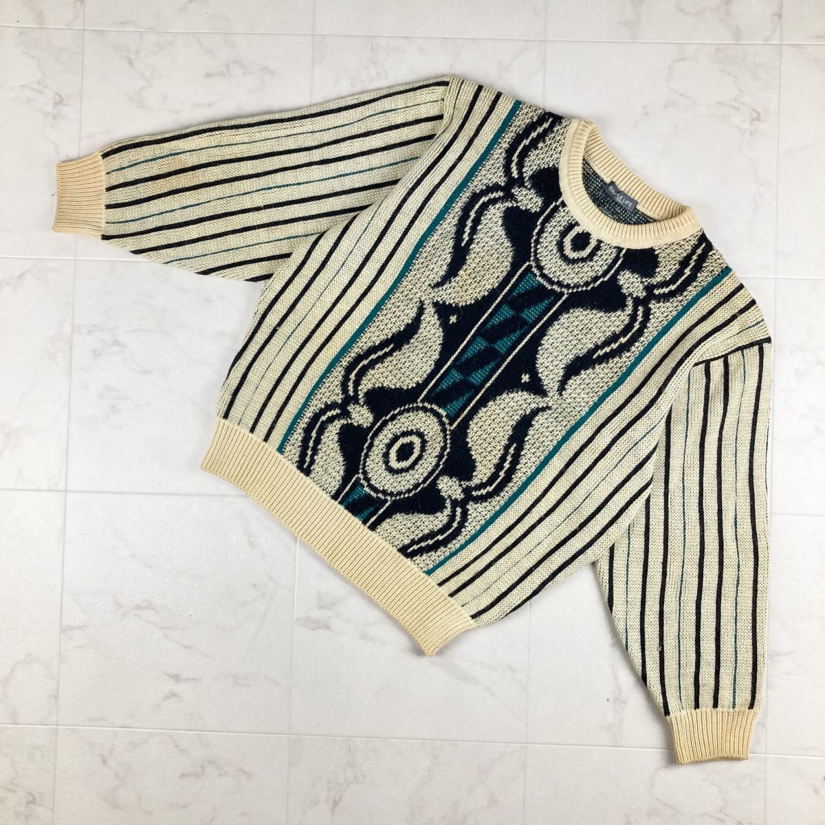 - SIMPLE LIFE シンプルライフ 柄編み ざっくりニットトップス ウール混 メンズ アイボリー 黒 ブラック 緑 グリーン サイズL*IC721