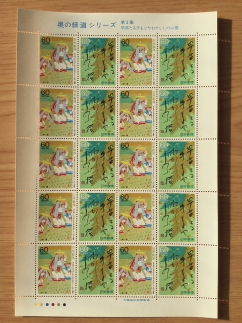 > 奥の細道シリーズ 第3集 早苗とる 手もとやむかし しのぶ摺 1シート(20面) 切手 未使用 1987年