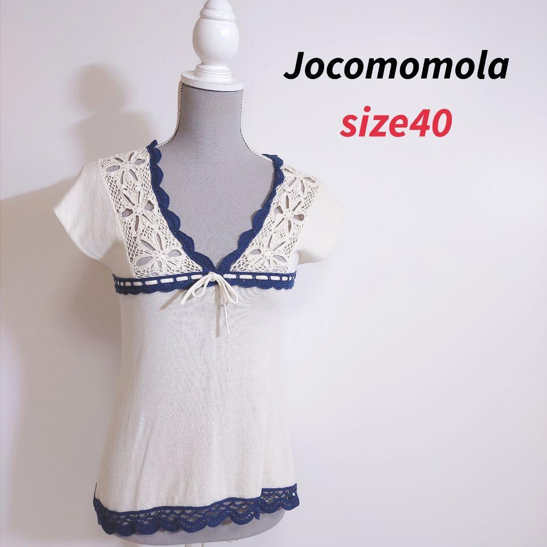 - Jocomomola フレンチスリーブ風 クロシェ使い 半袖コットンニット 表記サイズ40 L 鍵編み レース オフホワイト&ネイビー シビラ Sybilla