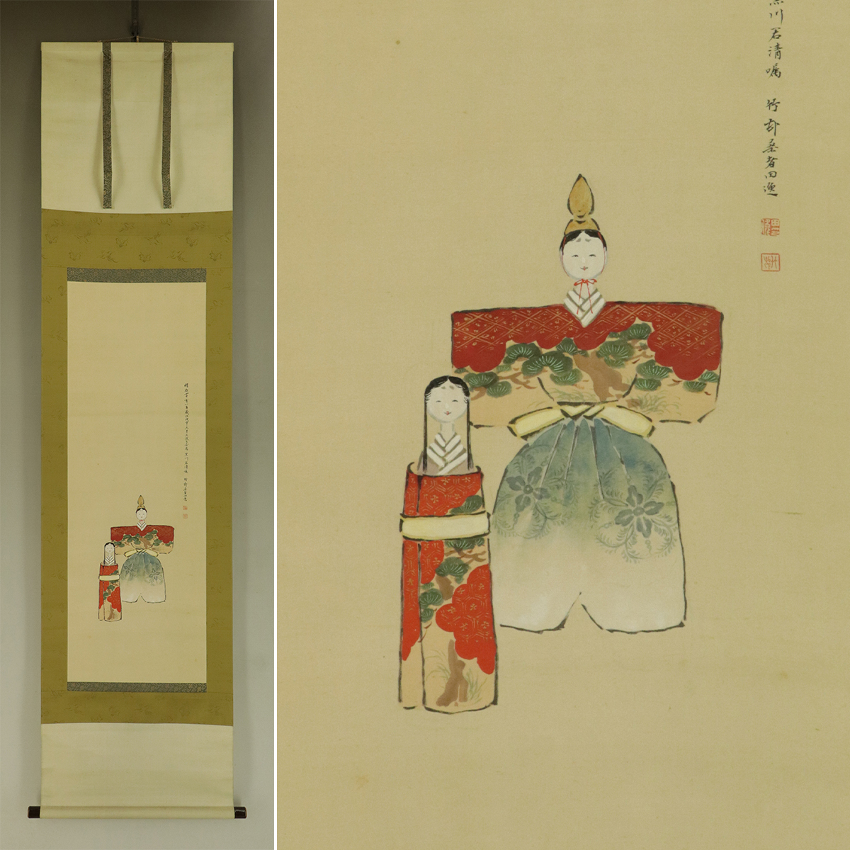 - 【真作】田近竹邨【紙雛図】◆絹本◆共箱◆掛軸 u10166