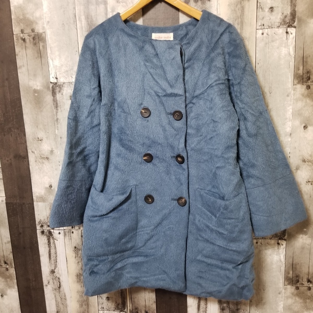 > YOSHIE INABA ヨシエイナバ ノーカラー コート サイズ9 ウール 裏地シルク100% ダブルボタン レディース