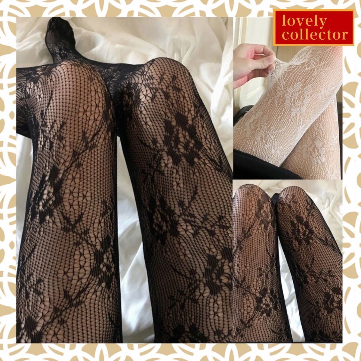 - 網タイツ ストッキング ロリータスタイルの透かし彫り フローラルレース 黒