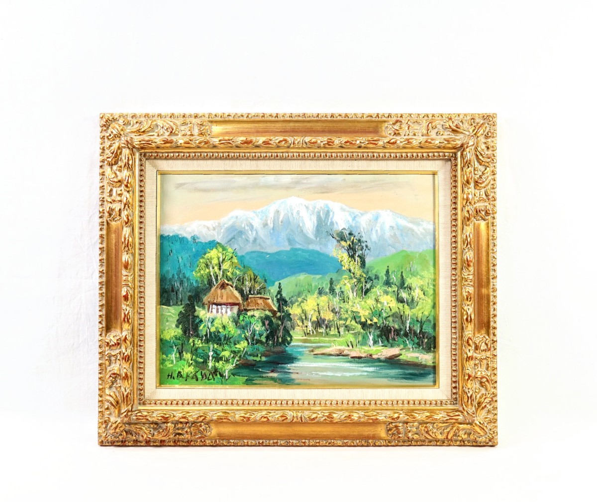 - 真作 大川一 油彩「山里風景」画寸 41cm×32cm F6 岐阜県出身 日画会会員 雪混じりの山稜と河畔の古民家と森林を描いた長閑な田舎風景 8237