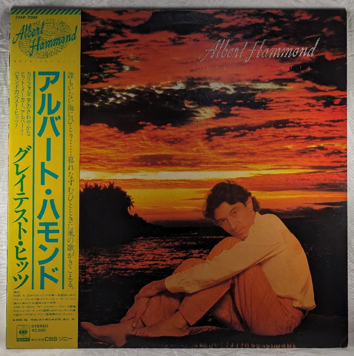 25AP2098 CBSソニー 中古LP「GREATEST HITS / グレーテスト・ヒッツ」ALBERT HAMMOND / アルバート・ハモンド SIDE A1 IT NEVER RAINS IN SOUTHERN CALIFORNIA / カリフォルニアの青い空2 I DON'T WANNA DIE IN AN AIR DISASTER / 悲しみのジェット・プレイン3 WOMAN OF THE WORLD / ウーマン・オブ・ザ・ワールド4 THE GIRL THEY CALL THE COOL BREEZE / そよ風の少女5 THE AIR THAT I BREATHE / 安らぎの世界へ SIDE B1 SMOKEY FACTORY BLUES / スモーキー・ファクトリー・ブルース2 NEW YORK CITY HERE I COME / 憧れのニュー・ヨーク・シティー3 FOUNTAIN AVENUE / 悲しみのフォウンテン大通り4 DIME QUEEN OF NEVADA / ネバダのギャンブラー5 FOR THE PEACE OF ALL MANKIND / 落葉のコンチェルト 盤質:良好ジャケット:角当て・スレあり歌詞カード付き 書き込みあり帯付き 送料は送料・配送についてをご覧ください。中古レコードに関してご理解のうえご入札ください